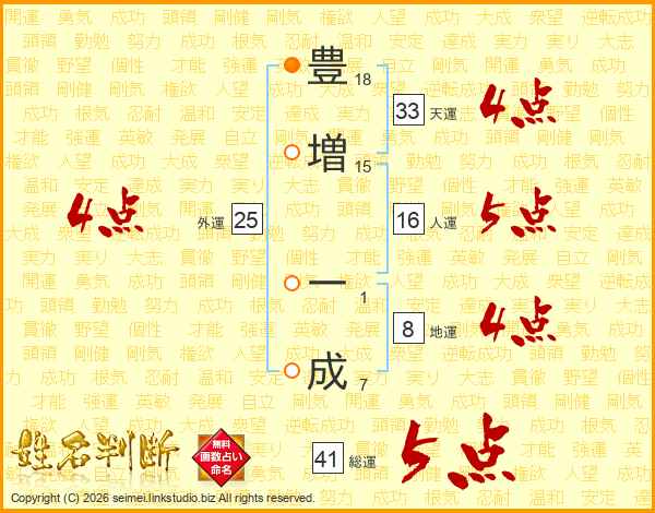 生活面を象徴する運勢です。外部から受ける影響力を表し、結婚運、家庭運や職場、環境への順応性を表します。総運から人運を引いた画数。姓や名が1文字の場合を除く。