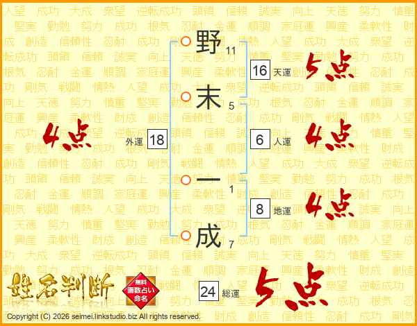 野末一成さんの総運は24画の5点!