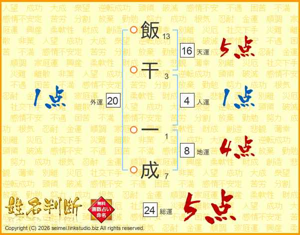 生活面を象徴する運勢です。外部から受ける影響力を表し、結婚運、家庭運や職場、環境への順応性を表します。総運から人運を引いた画数。姓や名が1文字の場合を除く。