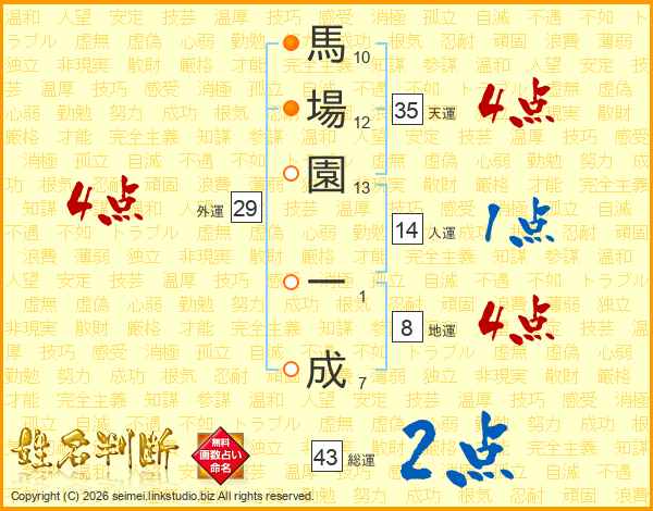 馬(10画)場(12画)園(13画) 一(1画)成(7画)