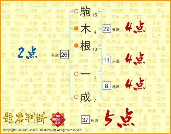 駒(15画)木(4画)根(10画) 一(1画)成(7画)