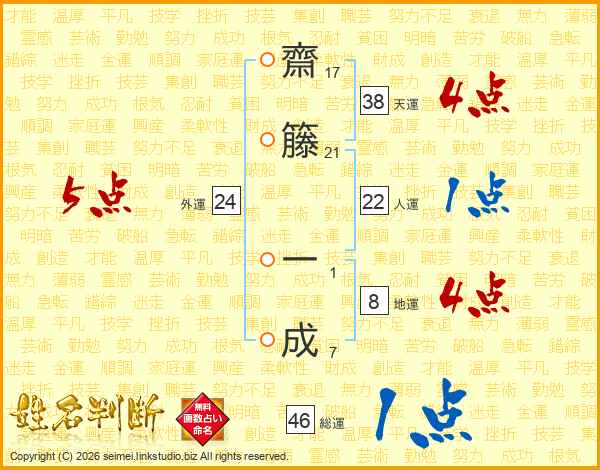 生活面を象徴する運勢です。外部から受ける影響力を表し、結婚運、家庭運や職場、環境への順応性を表します。総運から人運を引いた画数。姓や名が1文字の場合を除く。