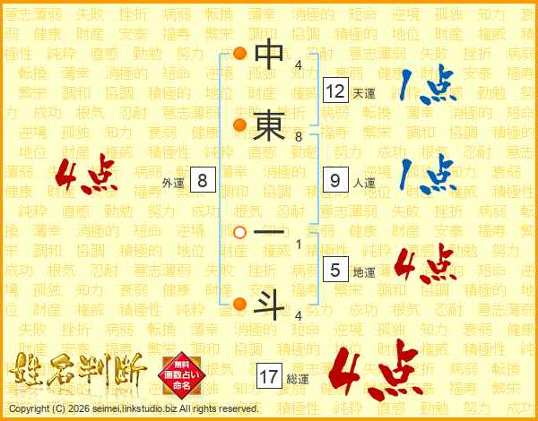 生活面を象徴する運勢です。外部から受ける影響力を表し、結婚運、家庭運や職場、環境への順応性を表します。総運から人運を引いた画数。姓や名が1文字の場合を除く。