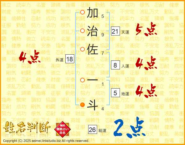 加(5画)治(9画)佐(7画) 一(1画)斗(4画)