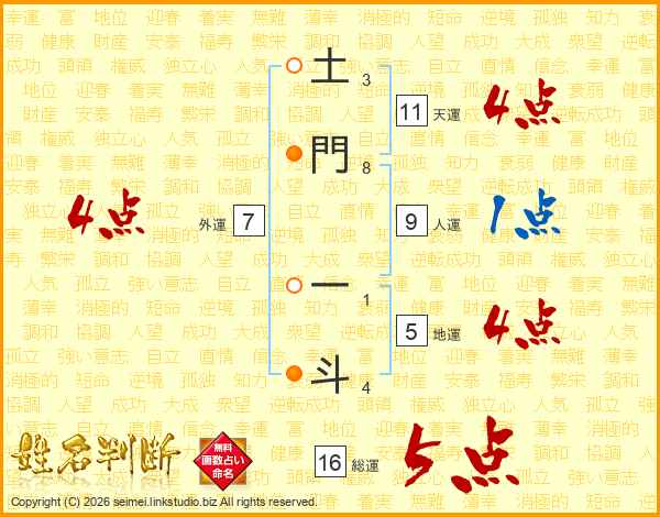 生活面を象徴する運勢です。外部から受ける影響力を表し、結婚運、家庭運や職場、環境への順応性を表します。総運から人運を引いた画数。姓や名が1文字の場合を除く。
