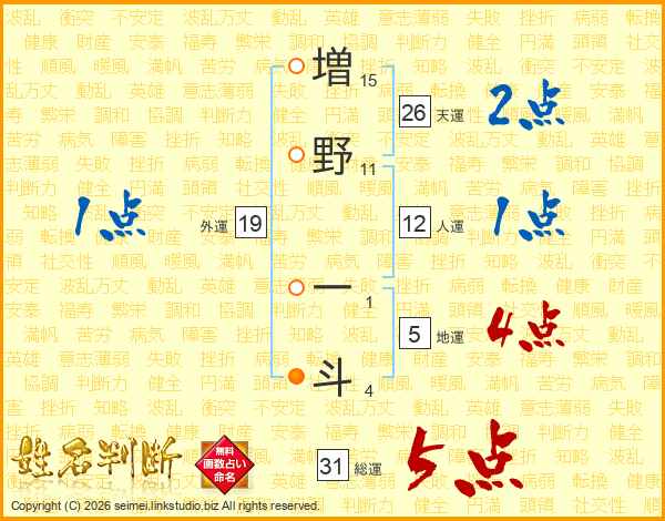 生活面を象徴する運勢です。外部から受ける影響力を表し、結婚運、家庭運や職場、環境への順応性を表します。総運から人運を引いた画数。姓や名が1文字の場合を除く。