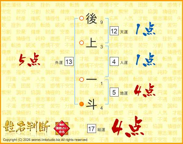 生活面を象徴する運勢です。外部から受ける影響力を表し、結婚運、家庭運や職場、環境への順応性を表します。総運から人運を引いた画数。姓や名が1文字の場合を除く。