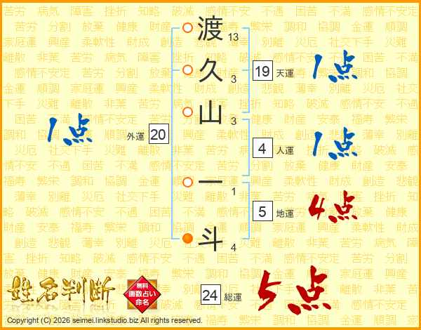 渡(13画)久(3画)山(3画) 一(1画)斗(4画)