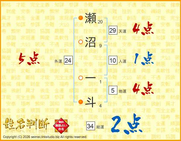 瀬沼一斗さんの天運は29画の4点!
