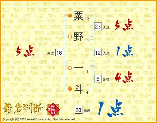 生活面を象徴する運勢です。外部から受ける影響力を表し、結婚運、家庭運や職場、環境への順応性を表します。総運から人運を引いた画数。姓や名が1文字の場合を除く。
