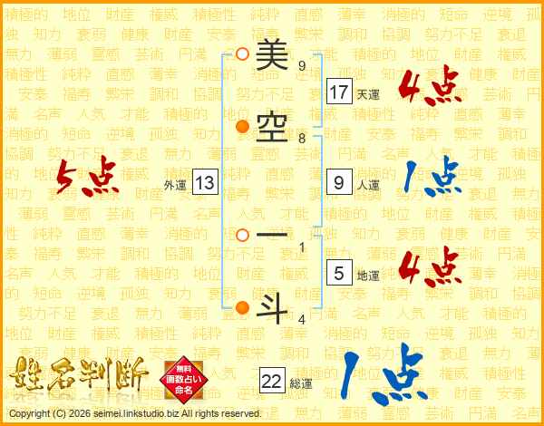 生活面を象徴する運勢です。外部から受ける影響力を表し、結婚運、家庭運や職場、環境への順応性を表します。総運から人運を引いた画数。姓や名が1文字の場合を除く。