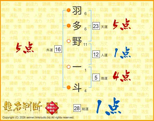 羽(6画)多(6画)野(11画) 一(1画)斗(4画)