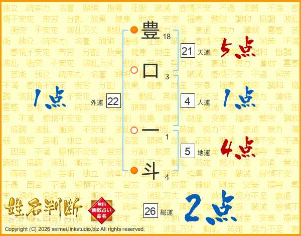 生活面を象徴する運勢です。外部から受ける影響力を表し、結婚運、家庭運や職場、環境への順応性を表します。総運から人運を引いた画数。姓や名が1文字の場合を除く。