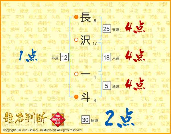 長(8画)沢(17画) 一(1画)斗(4画)