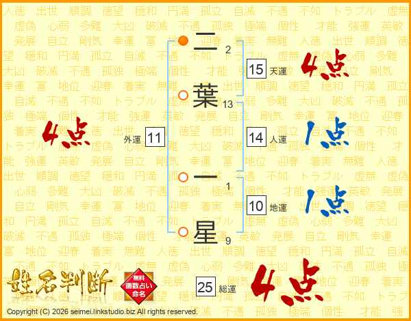 生活面を象徴する運勢です。外部から受ける影響力を表し、結婚運、家庭運や職場、環境への順応性を表します。総運から人運を引いた画数。姓や名が1文字の場合を除く。