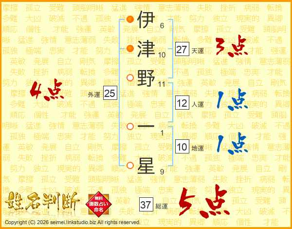 伊(6画)津(10画)野(11画) 一(1画)星(9画)
