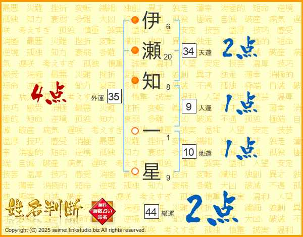 伊(6画)瀬(20画)知(8画) 一(1画)星(9画)