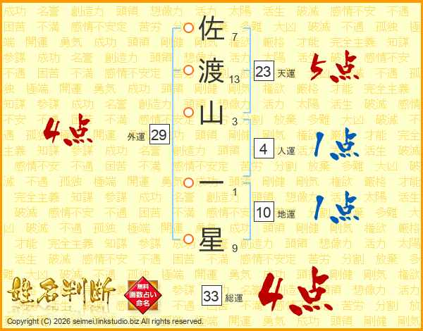 佐渡山一星さんの総運は33画の4点!