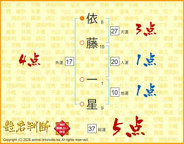 生活面を象徴する運勢です。外部から受ける影響力を表し、結婚運、家庭運や職場、環境への順応性を表します。総運から人運を引いた画数。姓や名が1文字の場合を除く。