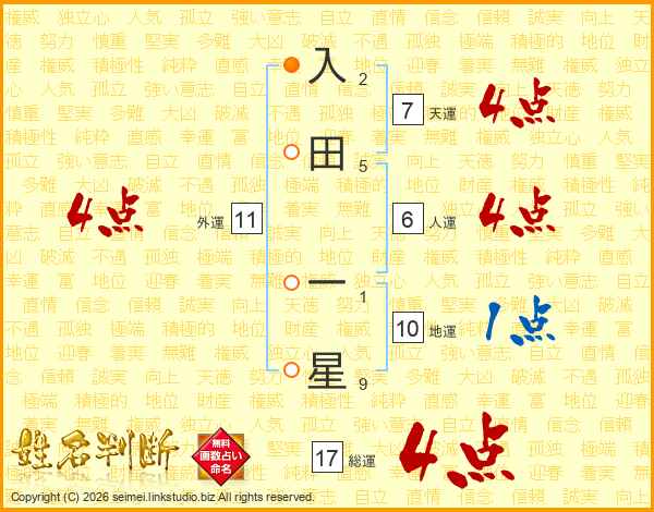 生活面を象徴する運勢です。外部から受ける影響力を表し、結婚運、家庭運や職場、環境への順応性を表します。総運から人運を引いた画数。姓や名が1文字の場合を除く。