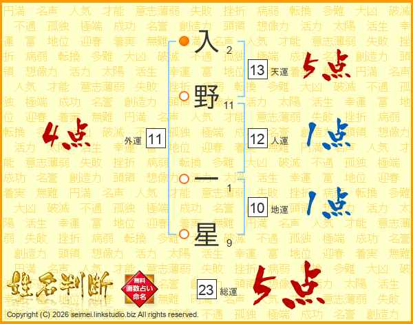 生活面を象徴する運勢です。外部から受ける影響力を表し、結婚運、家庭運や職場、環境への順応性を表します。総運から人運を引いた画数。姓や名が1文字の場合を除く。