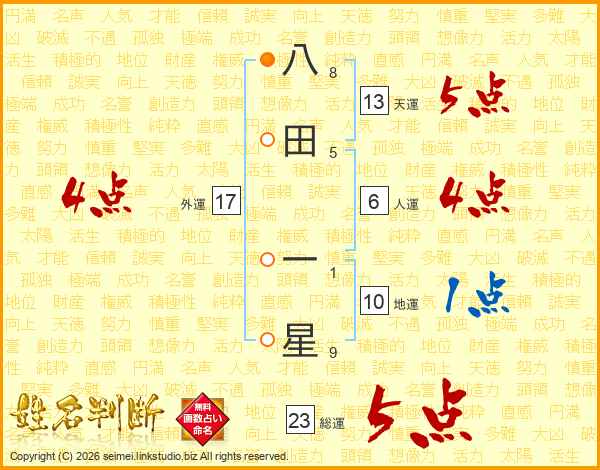 生活面を象徴する運勢です。外部から受ける影響力を表し、結婚運、家庭運や職場、環境への順応性を表します。総運から人運を引いた画数。姓や名が1文字の場合を除く。