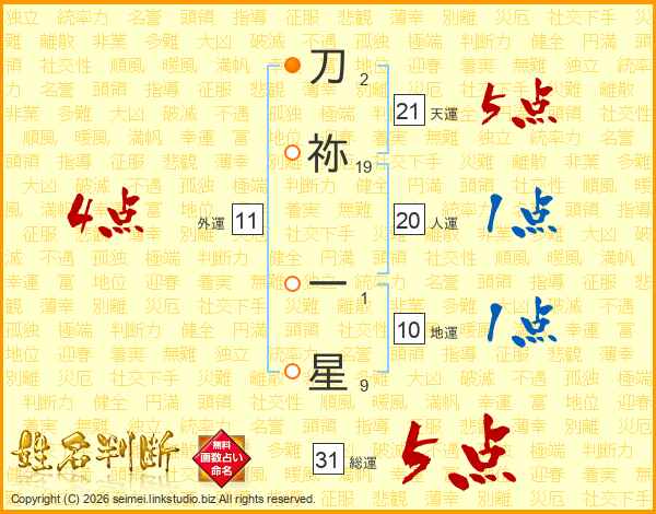 刀祢一星さんの総運は31画の5点!
