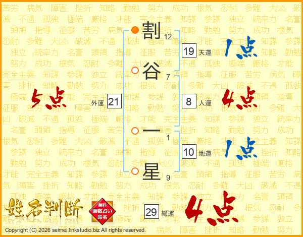 生活面を象徴する運勢です。外部から受ける影響力を表し、結婚運、家庭運や職場、環境への順応性を表します。総運から人運を引いた画数。姓や名が1文字の場合を除く。