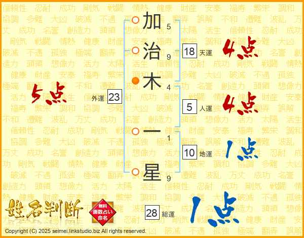 加(5画)治(9画)木(4画) 一(1画)星(9画)