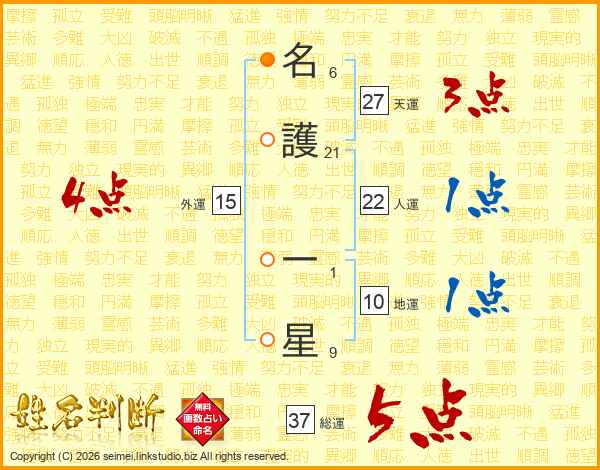 生活面を象徴する運勢です。外部から受ける影響力を表し、結婚運、家庭運や職場、環境への順応性を表します。総運から人運を引いた画数。姓や名が1文字の場合を除く。