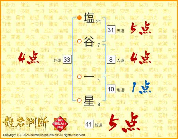 塩谷一星さんの総運は41画の5点!