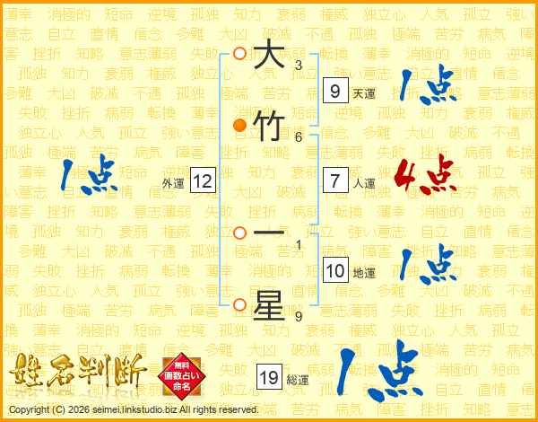 生活面を象徴する運勢です。外部から受ける影響力を表し、結婚運、家庭運や職場、環境への順応性を表します。総運から人運を引いた画数。姓や名が1文字の場合を除く。