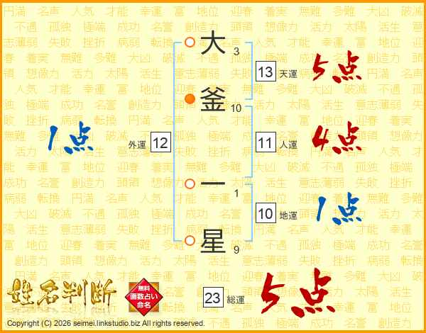 大釜一星さんの天運は13画の5点!