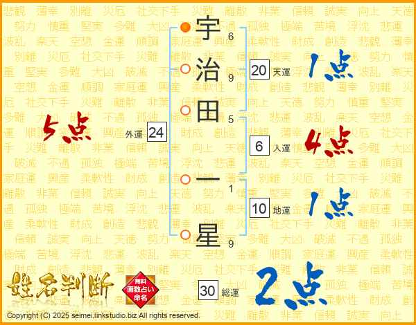 宇(6画)治(9画)田(5画) 一(1画)星(9画)