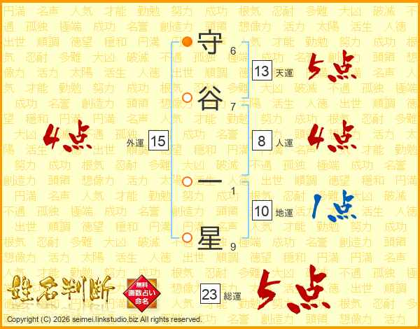 生活面を象徴する運勢です。外部から受ける影響力を表し、結婚運、家庭運や職場、環境への順応性を表します。総運から人運を引いた画数。姓や名が1文字の場合を除く。