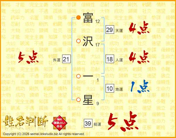 生活面を象徴する運勢です。外部から受ける影響力を表し、結婚運、家庭運や職場、環境への順応性を表します。総運から人運を引いた画数。姓や名が1文字の場合を除く。