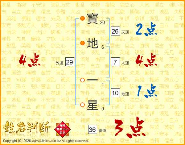 生活面を象徴する運勢です。外部から受ける影響力を表し、結婚運、家庭運や職場、環境への順応性を表します。総運から人運を引いた画数。姓や名が1文字の場合を除く。