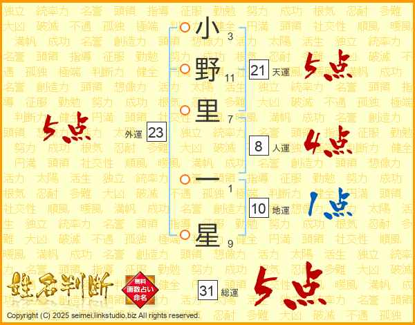 小野里一星さんの総運は31画の5点!