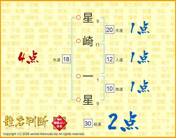 生活面を象徴する運勢です。外部から受ける影響力を表し、結婚運、家庭運や職場、環境への順応性を表します。総運から人運を引いた画数。姓や名が1文字の場合を除く。