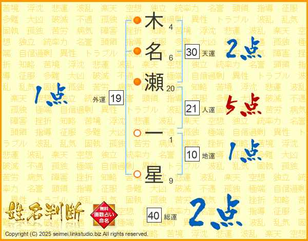木(4画)名(6画)瀬(20画) 一(1画)星(9画)