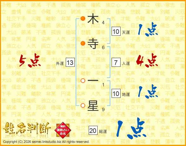 生活面を象徴する運勢です。外部から受ける影響力を表し、結婚運、家庭運や職場、環境への順応性を表します。総運から人運を引いた画数。姓や名が1文字の場合を除く。