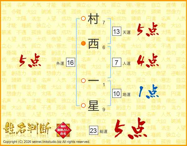 生活面を象徴する運勢です。外部から受ける影響力を表し、結婚運、家庭運や職場、環境への順応性を表します。総運から人運を引いた画数。姓や名が1文字の場合を除く。