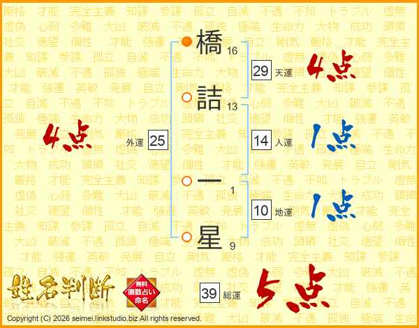 生活面を象徴する運勢です。外部から受ける影響力を表し、結婚運、家庭運や職場、環境への順応性を表します。総運から人運を引いた画数。姓や名が1文字の場合を除く。