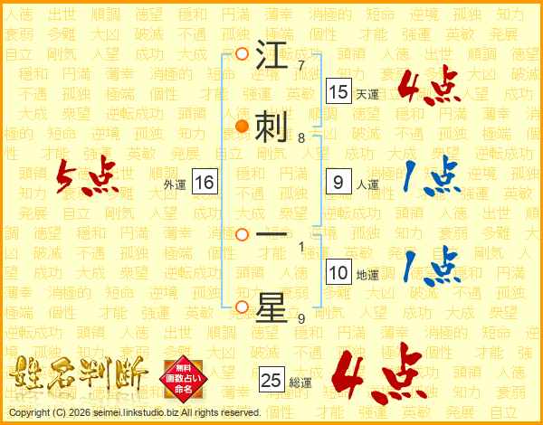 生活面を象徴する運勢です。外部から受ける影響力を表し、結婚運、家庭運や職場、環境への順応性を表します。総運から人運を引いた画数。姓や名が1文字の場合を除く。