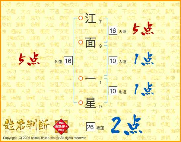 生活面を象徴する運勢です。外部から受ける影響力を表し、結婚運、家庭運や職場、環境への順応性を表します。総運から人運を引いた画数。姓や名が1文字の場合を除く。