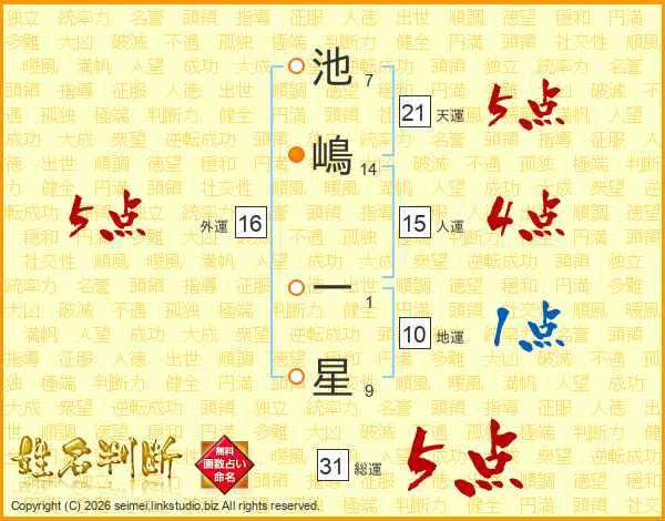 池嶋一星さんの総運は31画の5点!
