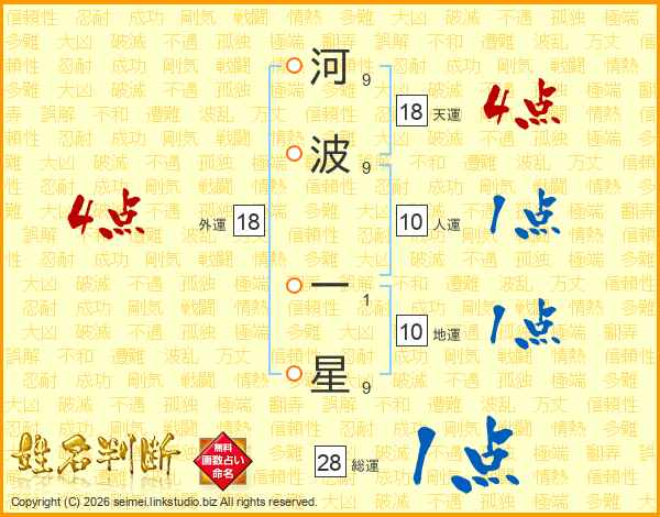 生活面を象徴する運勢です。外部から受ける影響力を表し、結婚運、家庭運や職場、環境への順応性を表します。総運から人運を引いた画数。姓や名が1文字の場合を除く。