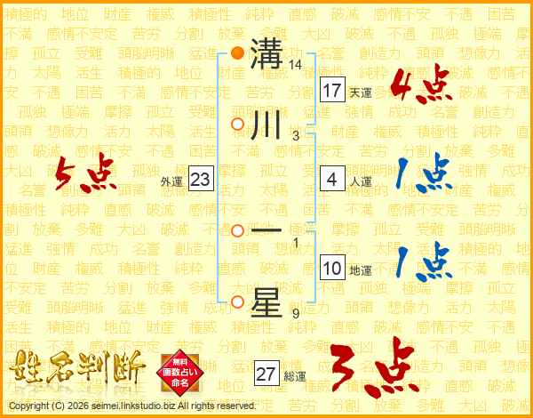 生活面を象徴する運勢です。外部から受ける影響力を表し、結婚運、家庭運や職場、環境への順応性を表します。総運から人運を引いた画数。姓や名が1文字の場合を除く。