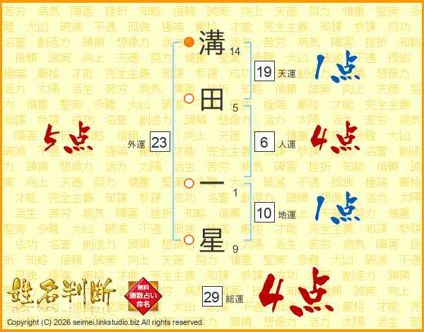 生活面を象徴する運勢です。外部から受ける影響力を表し、結婚運、家庭運や職場、環境への順応性を表します。総運から人運を引いた画数。姓や名が1文字の場合を除く。