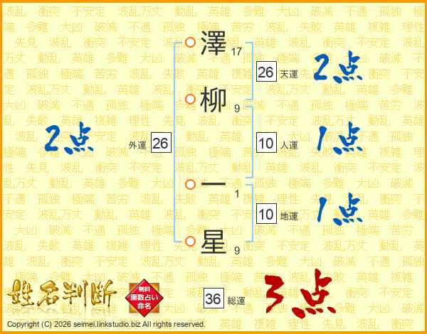 生活面を象徴する運勢です。外部から受ける影響力を表し、結婚運、家庭運や職場、環境への順応性を表します。総運から人運を引いた画数。姓や名が1文字の場合を除く。